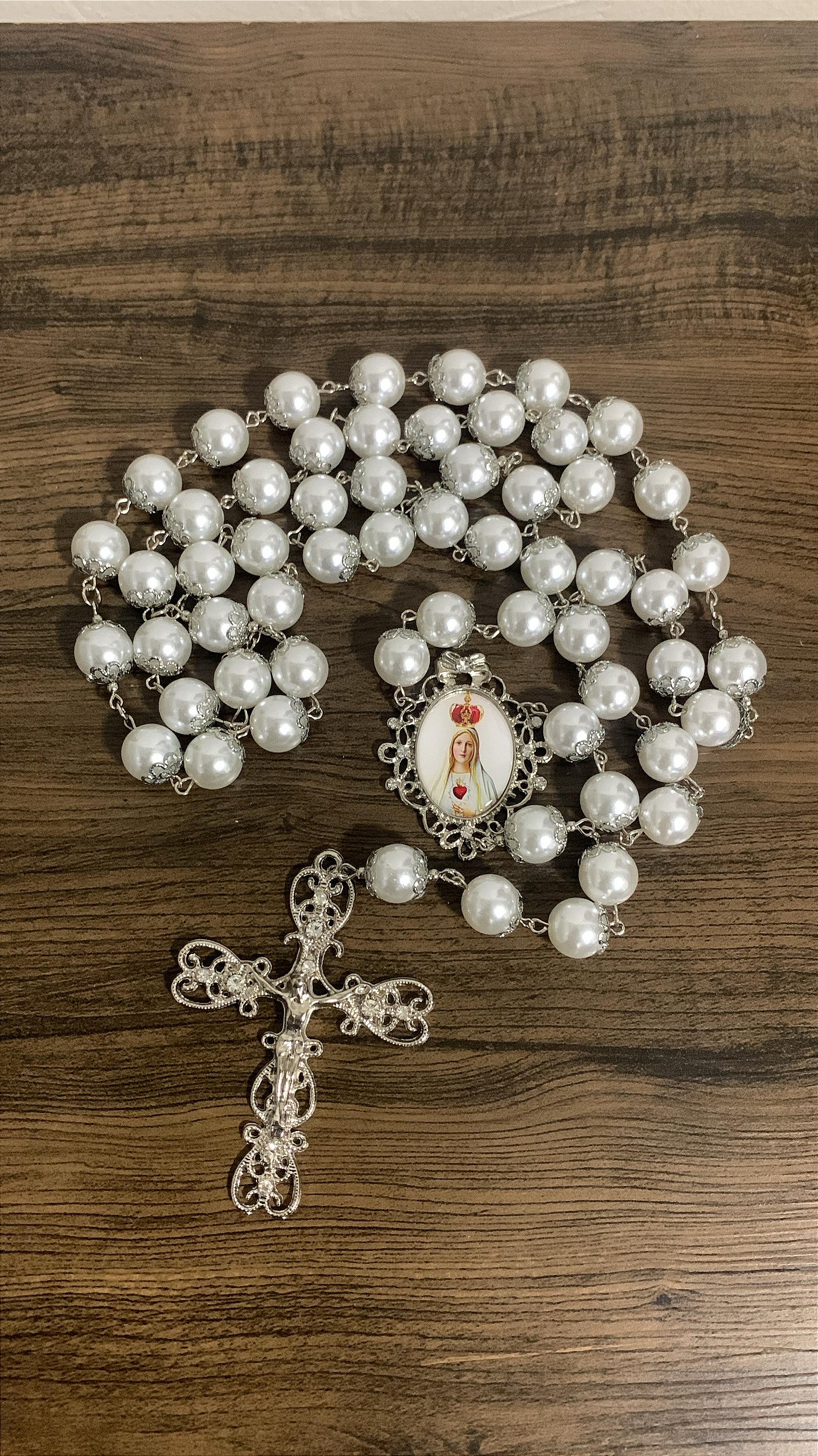 Terço de noiva grande Nossa Senhora de Fátima Arautos Pérolas 14mm